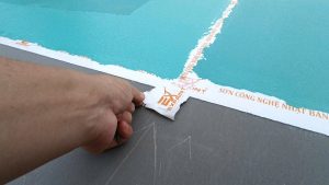 Trong quá trình thi công lớp màu lượt thứ nhất, khi bề mặt đã khô, công nhân có thể kẻ vạch theo thông số quy định bằng băng dính (tùy vào cách làm khéo tay của từng người thợ).